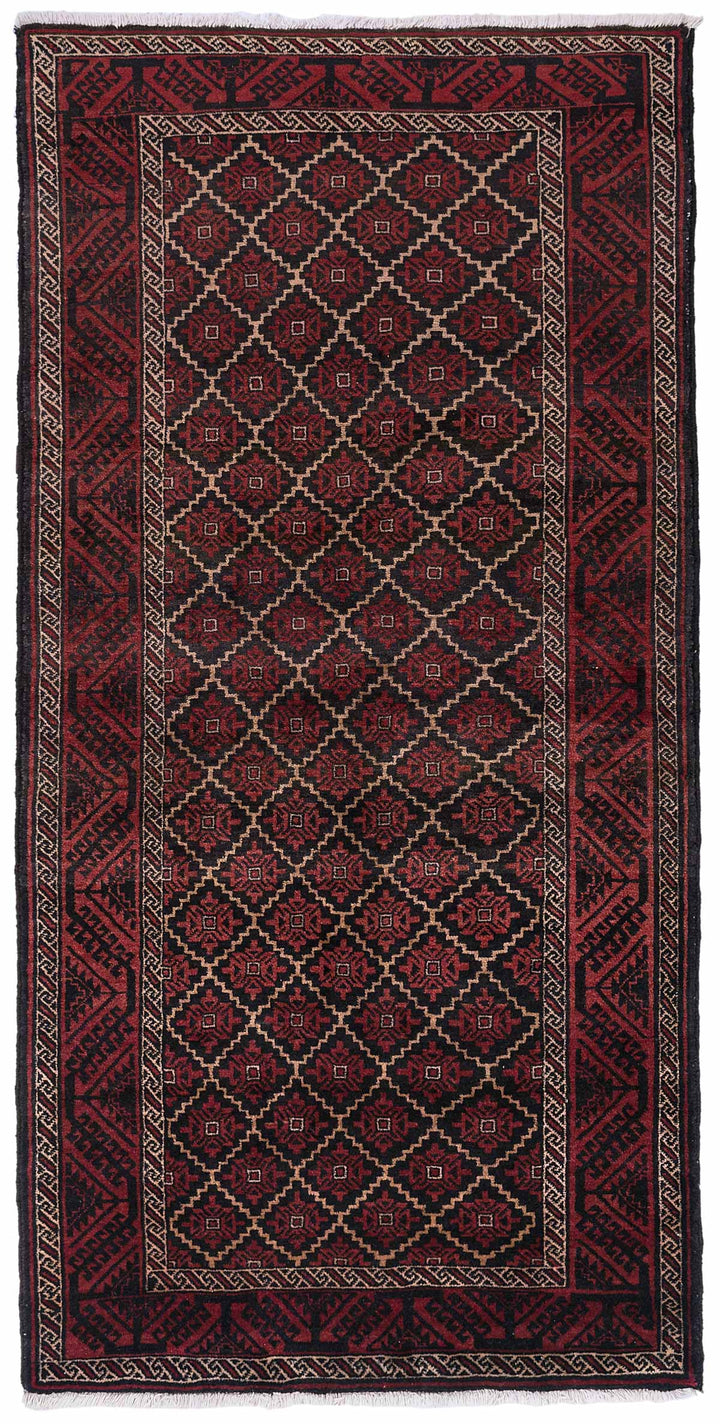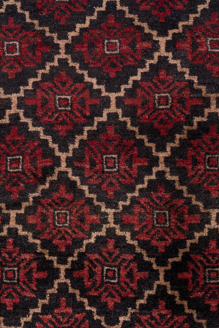 This is a Baluch rug (also known as Baluchi), handmade by the Baluch nomads. Traditionally, Baluch rugs are often small and feature lively patterns, predominantly in rich colours such as red, brown, and dark blue.