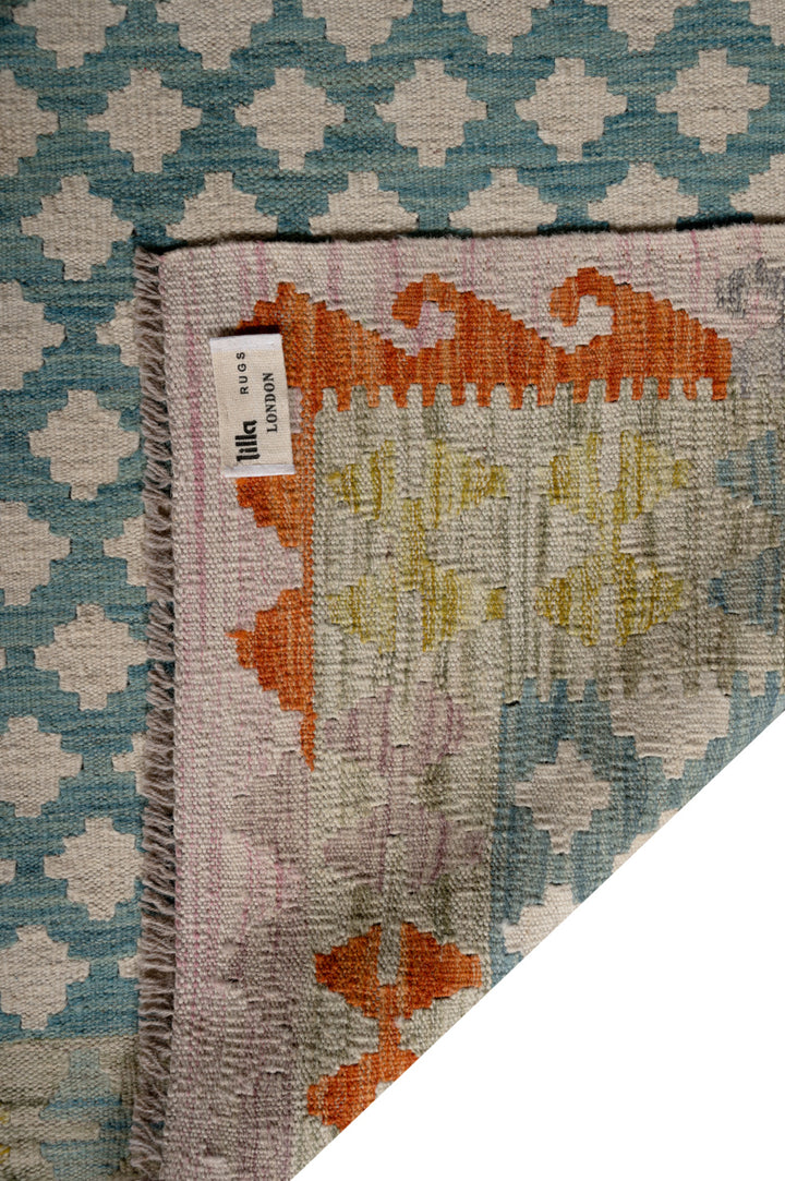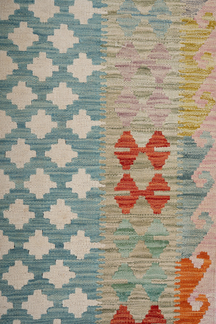 An Afghan Kilim rug is a flat-woven, hand-crafted rug known for its lightweight and durable structure. These rugs feature bold geometric patterns, often in tribal or symbolic designs, with a vibrant colour palette of reds, blues, browns, and creams. Unlike pile rugs, Afghan Kilims are made using a weaving technique that produces a thin, reversible rug without a thick pile. Crafted from high-quality wool, these rugs are valued for their versatility, making them suitable for use as floor coverings, wall hangings, or decorative accents in both modern and traditMional settings.