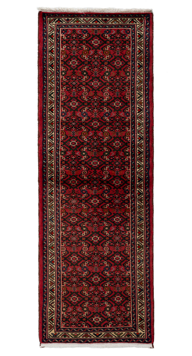 There are hundreds of Persian villages weaving carpets and rugs, it is still very much a cottage industry. Almost all have a wool pile and a cotton warp. Hossein Abad is one of the villages around the Hamadan area. Typically the colours used are deep reds and blues, the majority are geometric but on occasion you will find floral and animal motifs depicting the natural environment of the area.