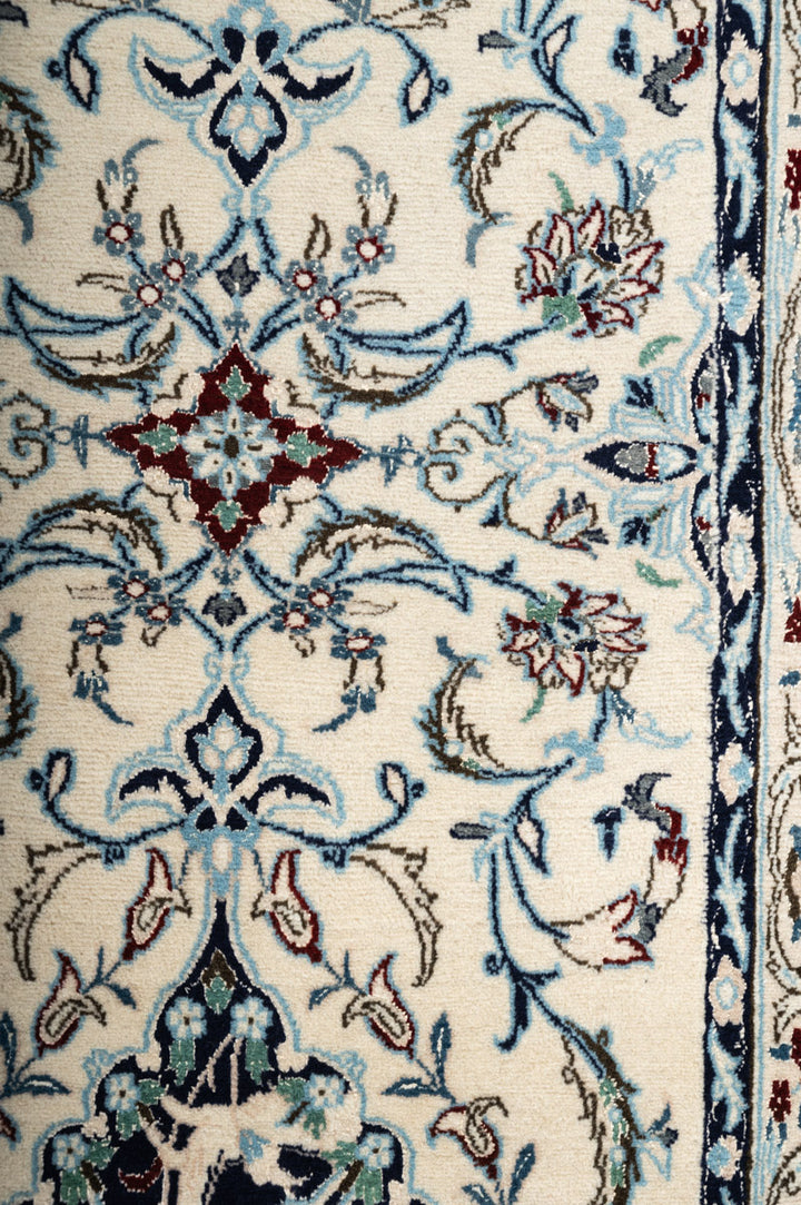 This is a Persian Nain rug, renowned for its fine and precise designs, crafted in a Persian city known for its high-quality workshops. Nain rugs feature a cotton foundation and a soft pile made of either wool or a wool-silk blend. The workmanship is exceptional, with a high knot density often exceeding one million knots per square metre.