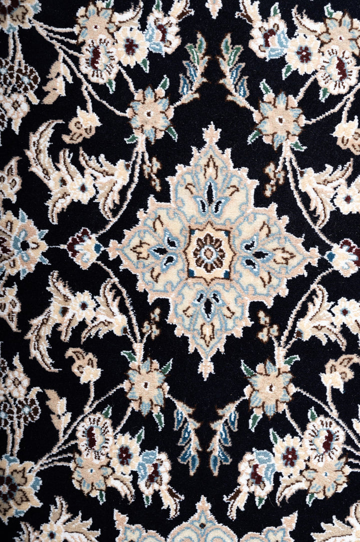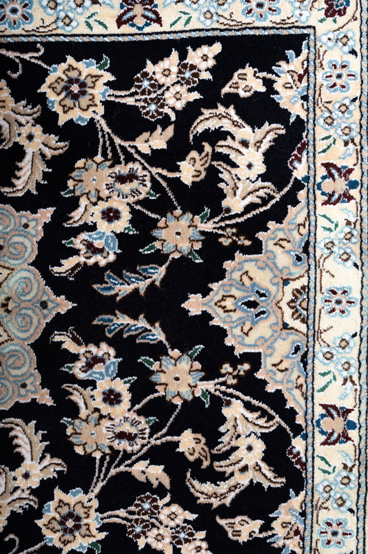 This is a Persian Nain rug, renowned for its fine and precise designs, crafted in a Persian city known for its high-quality workshops. Nain rugs feature a cotton foundation and a soft pile made of either wool or a wool-silk blend. The workmanship is exceptional, with a high knot density often exceeding one million knots per square metre.