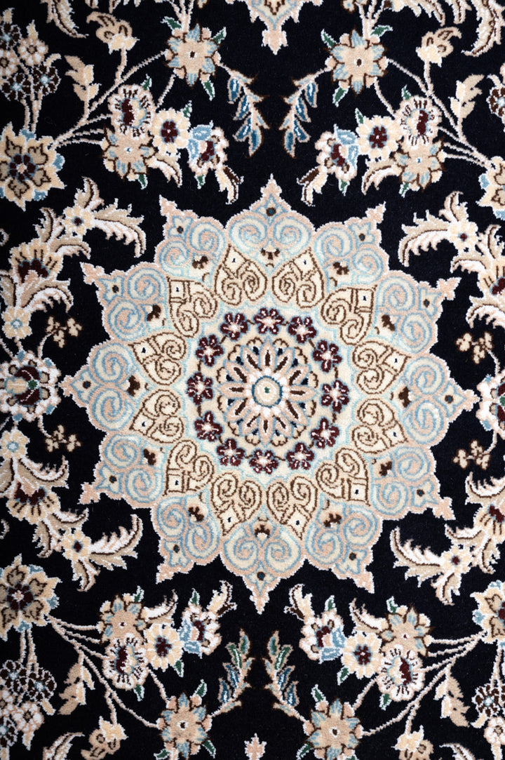Common patterns include a central medallion surrounded by intricate arabesques and floral motifs. Nain rugs utilize three types of knots: 4La, 6La, and 9La. The term "La" translates to "Layer," indicating the number of thread layers in each warp. This classification helps determine the rug's quality—lower numbers signify finer, denser knots, resulting in a more exquisite carpet.