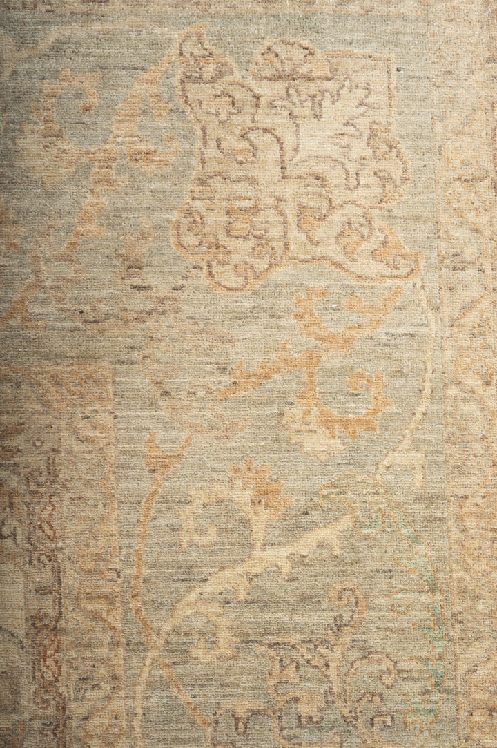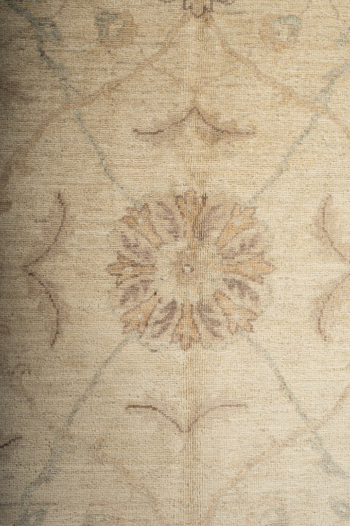 A Ziegler rug made in Afghanistan is a hand-knotted rug inspired by traditional Persian designs but with a more refined aesthetic. These rugs often feature soft, muted colour palettes, with earthy tones like beige, rust, and soft reds. The designs are typically floral or geometric, with intricate patterns that are understated. Afghan Ziegler rugs are known for their high-quality wool, fine craftsmanship, and durability, making them a popular choice for contemporary and traditional interiors alike.