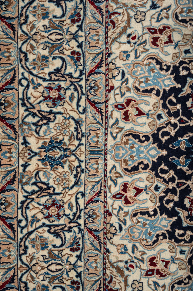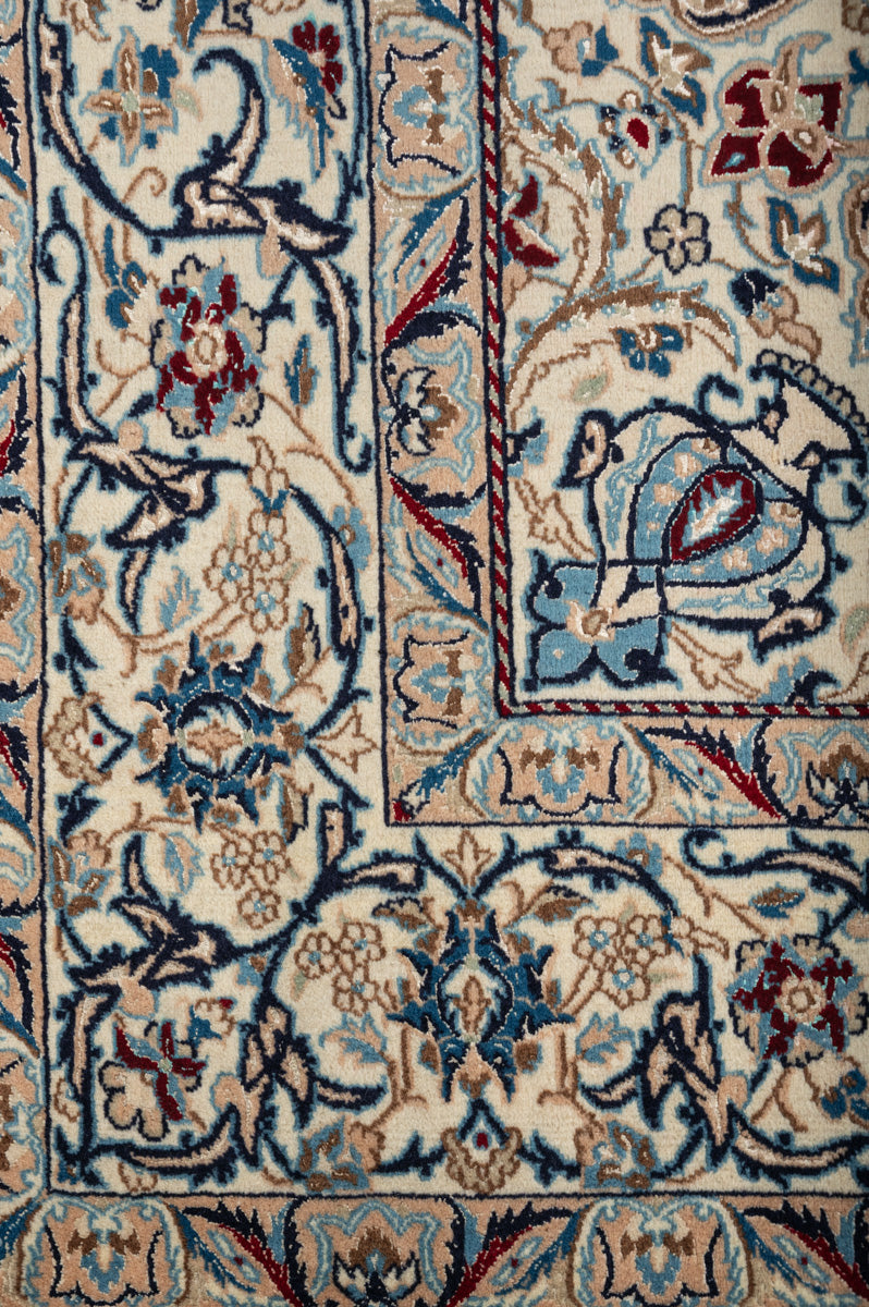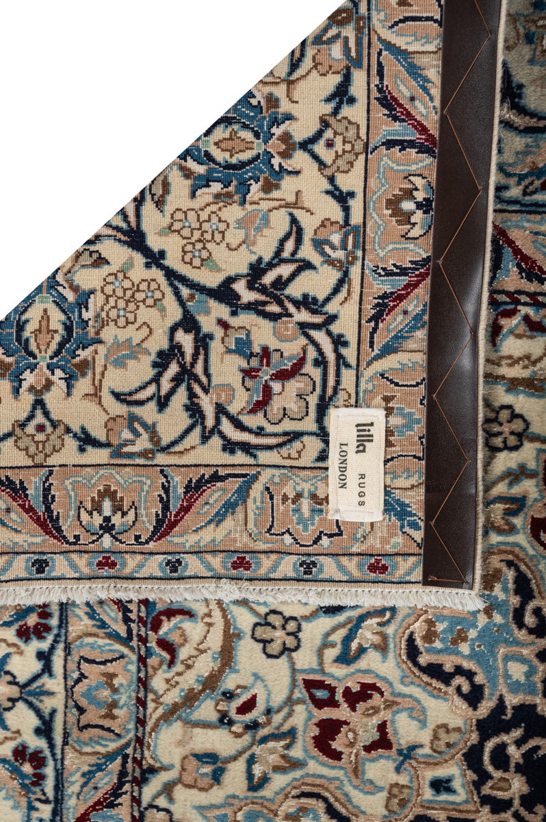This is a Persian Nain rug, renowned for its fine and precise designs, crafted in a Persian city known for its high-quality workshops. Nain rugs feature a cotton foundation and a soft pile made of either wool or a wool-silk blend. The workmanship is exceptional, with a high knot density often exceeding one million knots per square metre.