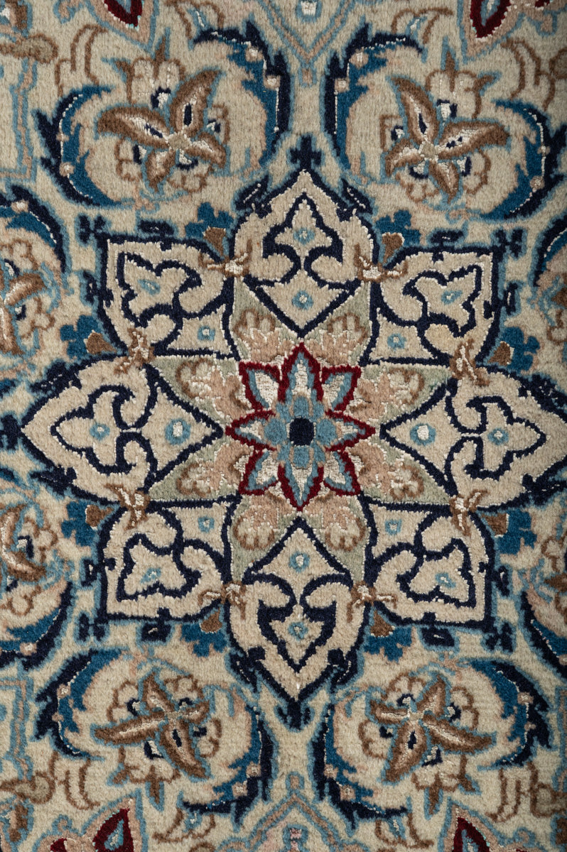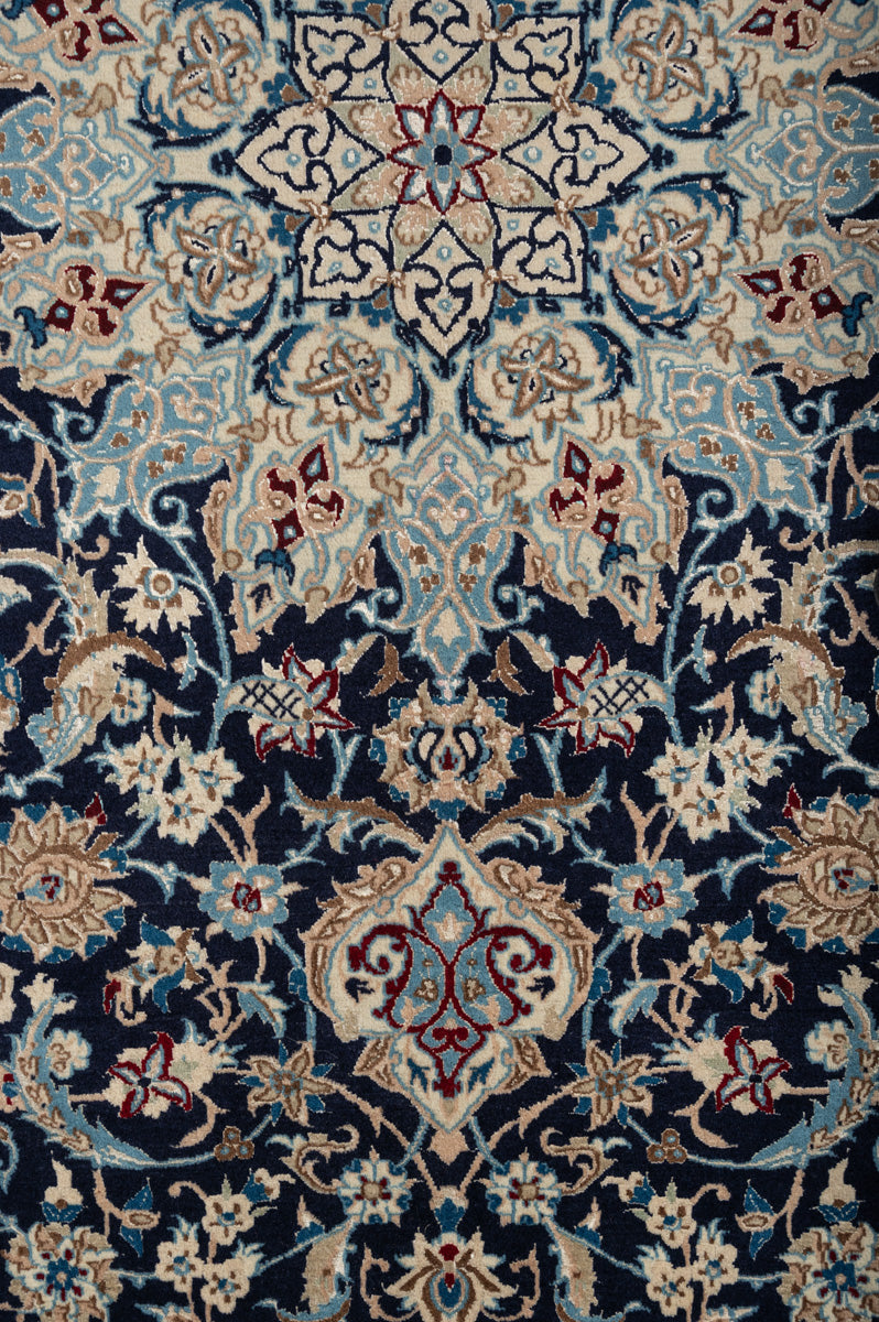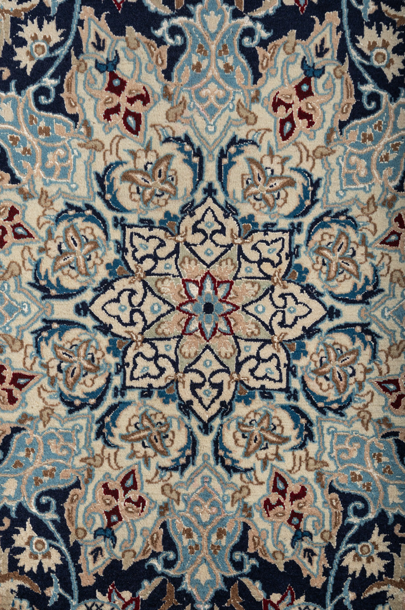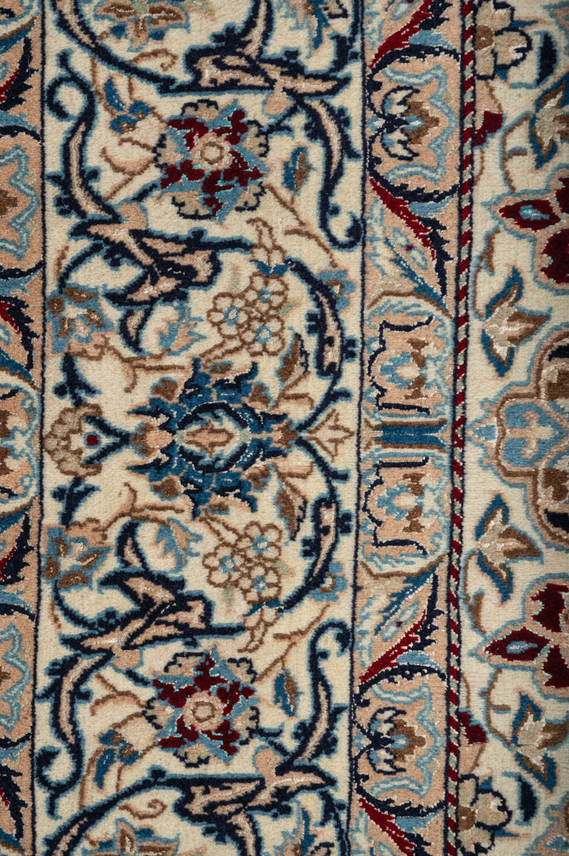This is a Persian Nain rug, renowned for its fine and precise designs, crafted in a Persian city known for its high-quality workshops. Nain rugs feature a cotton foundation and a soft pile made of either wool or a wool-silk blend. The workmanship is exceptional, with a high knot density often exceeding one million knots per square metre.