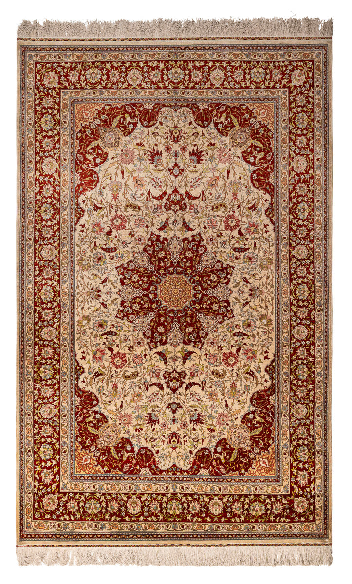 Hereke silk rugs Known for intricate detail, the symmetrical Turkish knot, and vibrant designs featuring floral and symbolic motifs, these double-knotted masterpieces were initially exclusive to royalty, becoming available to the public much later and remaining prized collector's items for their unparalleled quality, sheen, and craftsmanship.