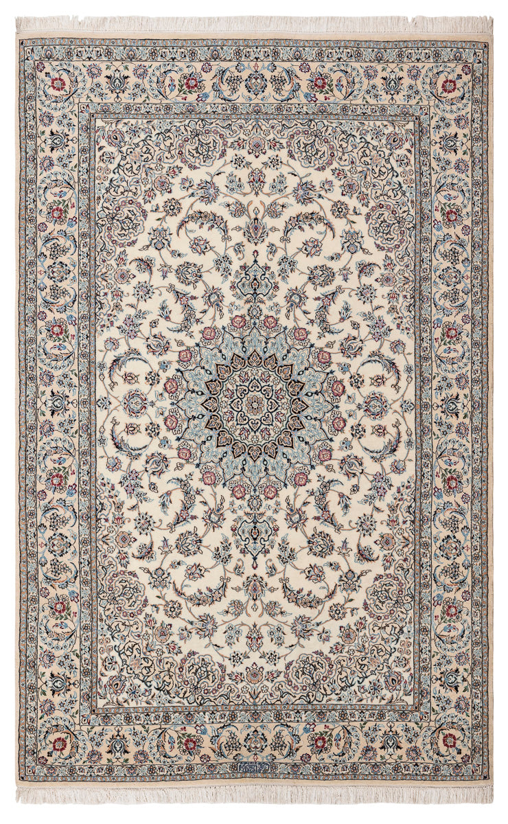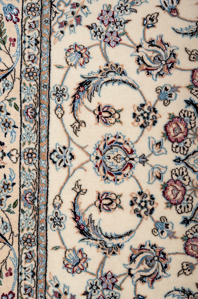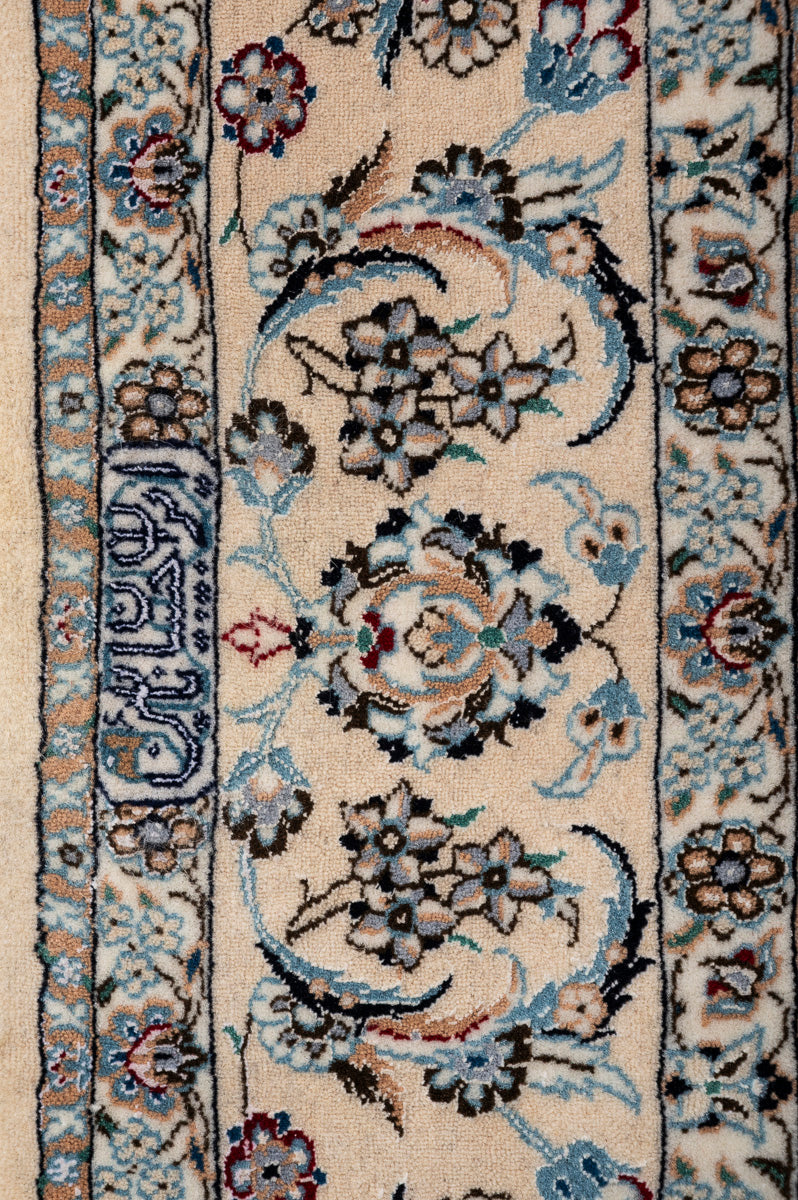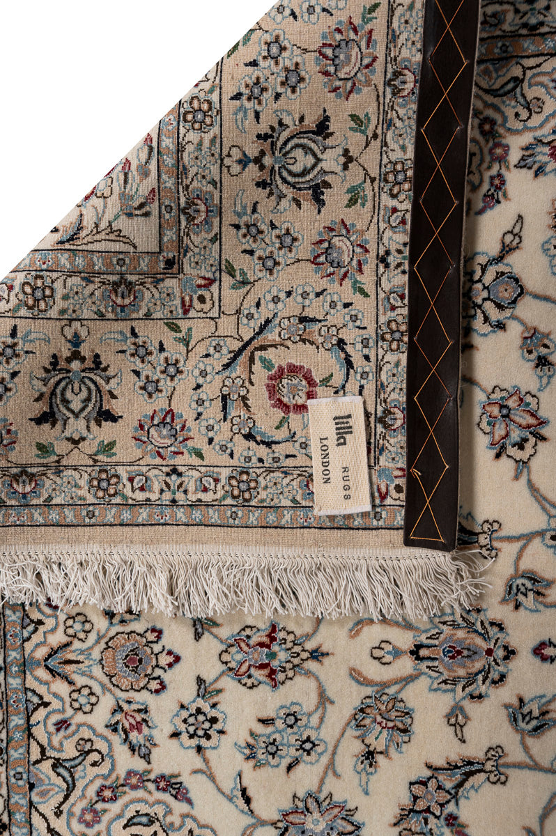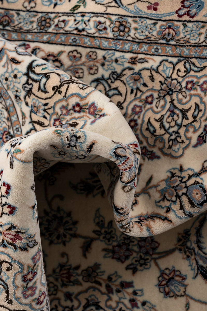 This is a Persian Nain rug, renowned for its fine and precise designs, crafted in a Persian city known for its high-quality workshops. Nain rugs feature a cotton foundation and a soft pile made of either wool or a wool-silk blend. The workmanship is exceptional, with a high knot density often exceeding one million knots per square metre.