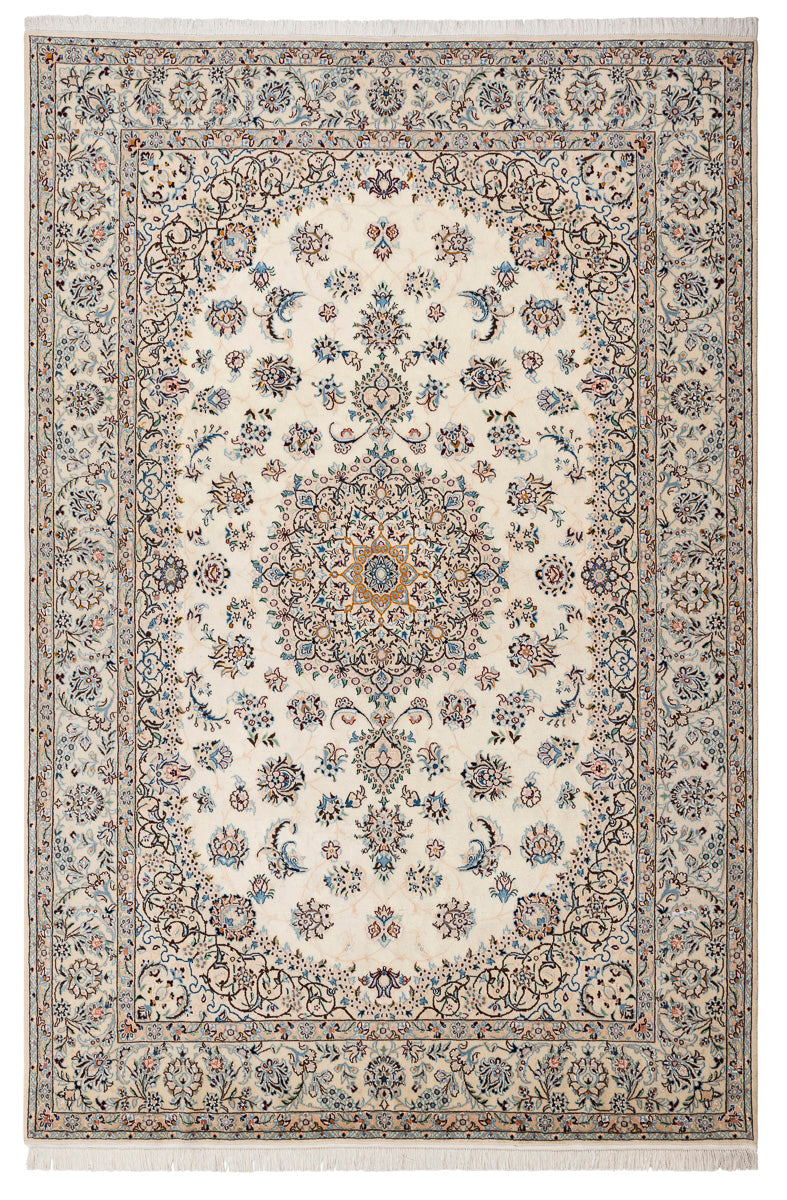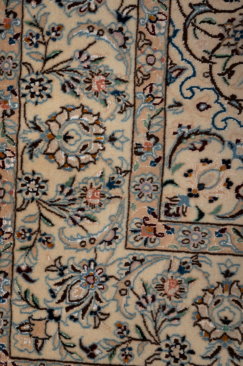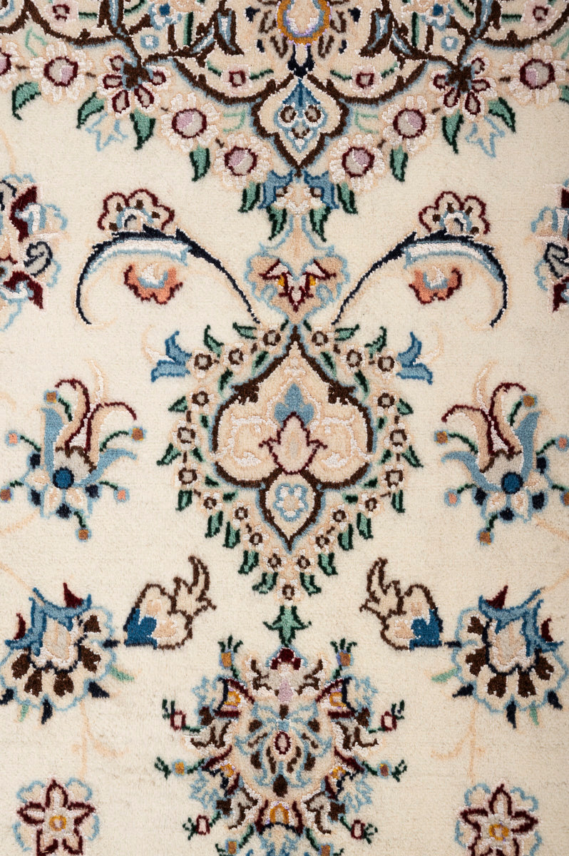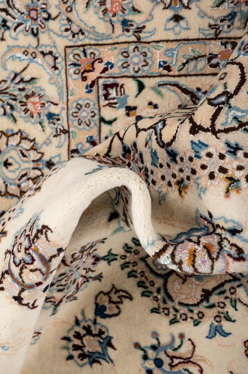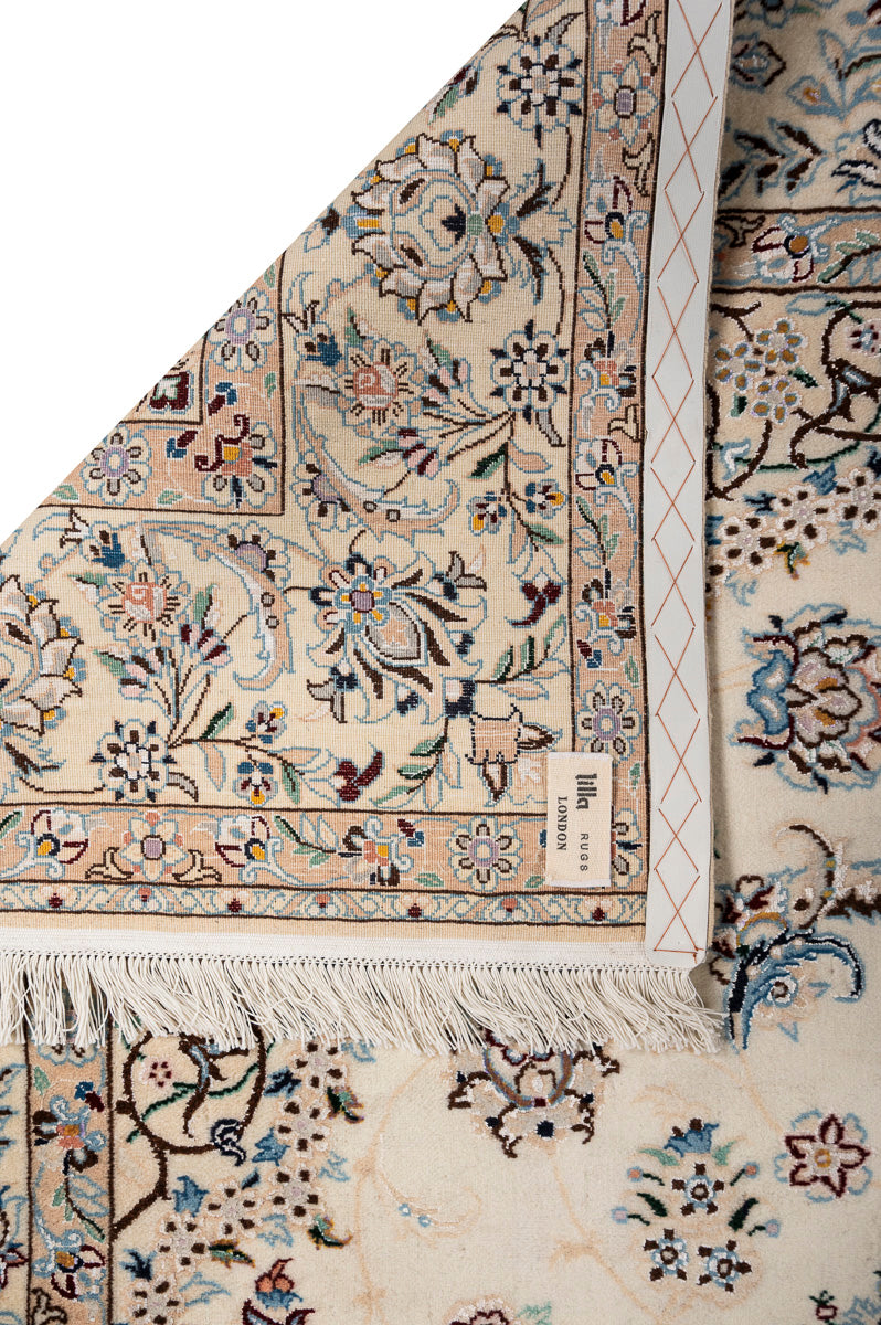 This is a Persian Nain rug, renowned for its fine and precise designs, crafted in a Persian city known for its high-quality workshops. Nain rugs feature a cotton foundation and a soft pile made of either wool or a wool-silk blend. The workmanship is exceptional, with a high knot density often exceeding one million knots per square metre.