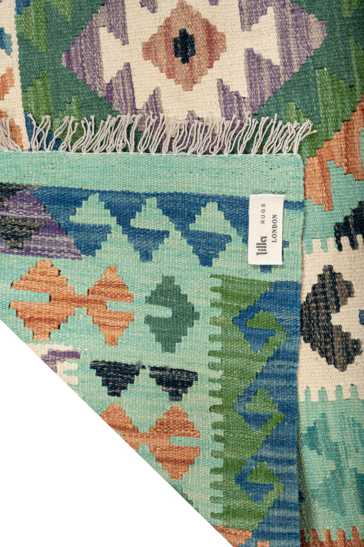 An Afghan Kilim rug is a flat-woven, hand-crafted rug known for its lightweight and durable structure. These rugs feature bold geometric patterns, often in tribal or symbolic designs, with a vibrant colour palette of reds, blues, browns, and creams. Unlike pile rugs, Afghan Kilims are made using a weaving technique that produces a thin, reversible rug without a thick pile. Crafted from high-quality wool, these rugs are valued for their versatility, making them suitable for use as floor coverings, wall hangings, or decorative accents in both modern and traditMional settings.