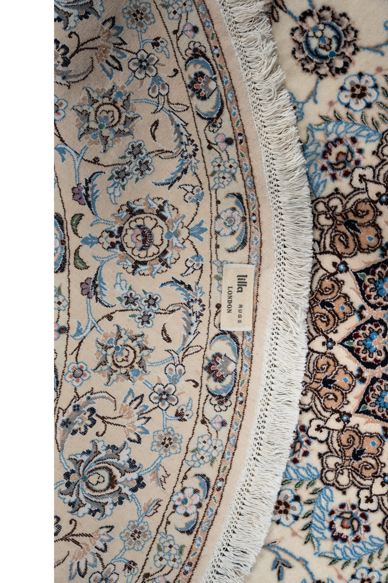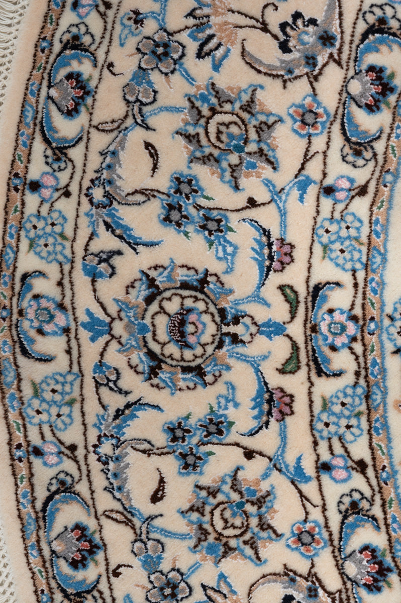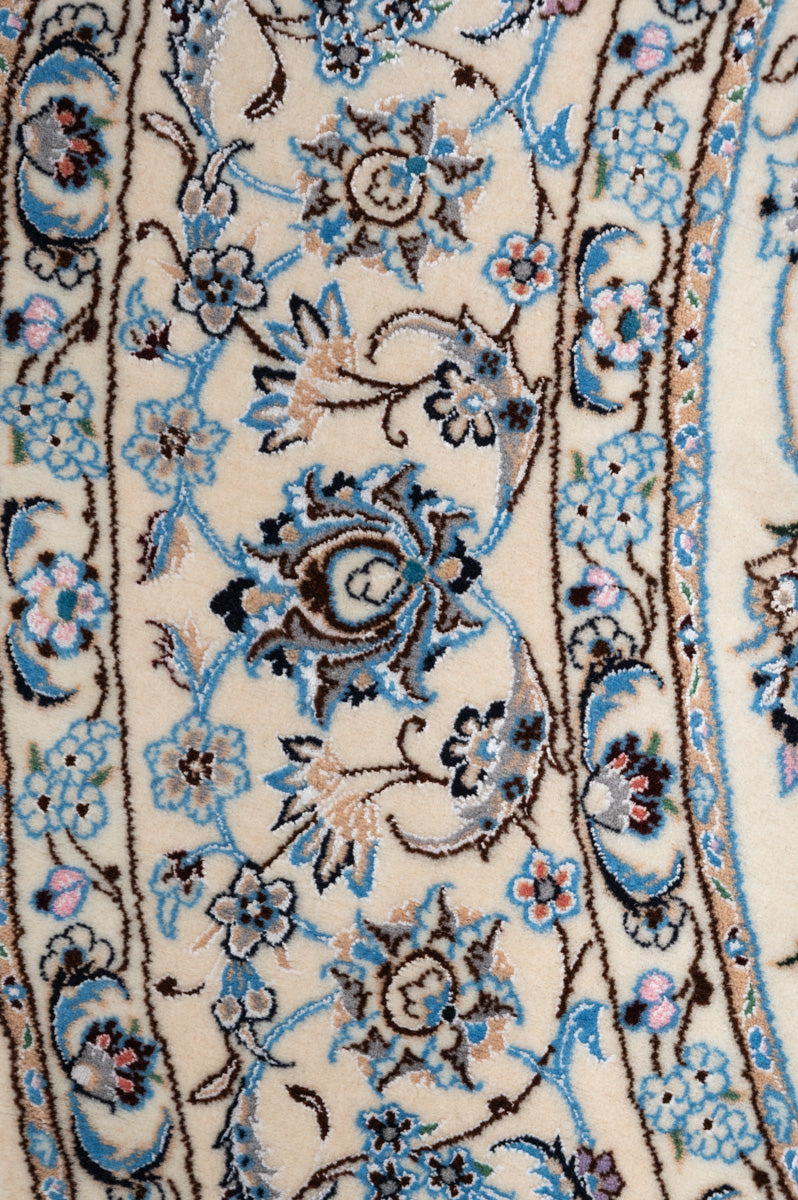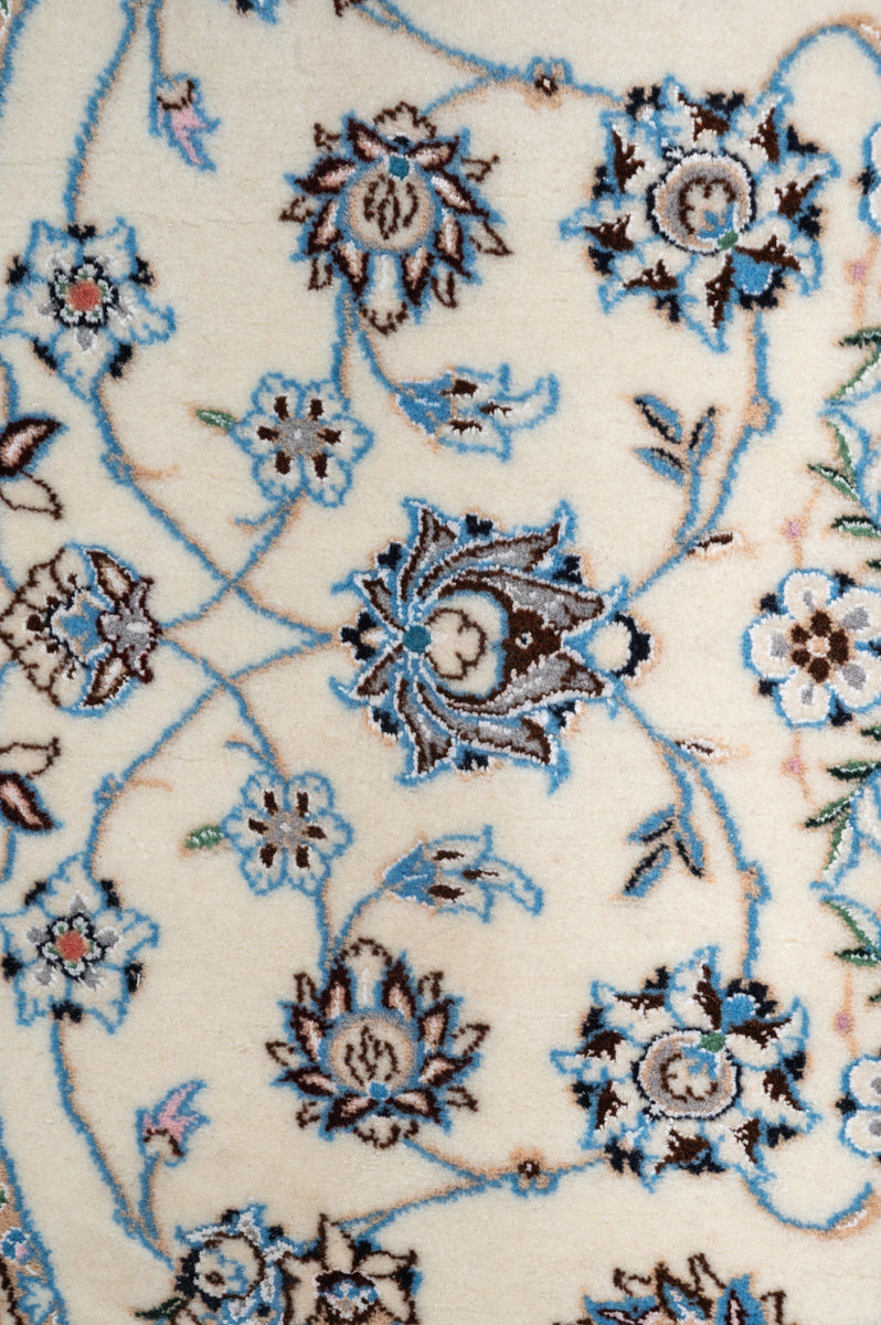 This is a Persian Nain rug. Nain is a town 150km to the east of Isfahan in central Iran. Very fine and precise designs were created due to the high quality of the workshops in the area. Nain rugs have a cotton foundation with a very soft wool or wool & silk pule. The workmanship is of the highest class and the knot density is also high (often more than one million knots per square meter).
